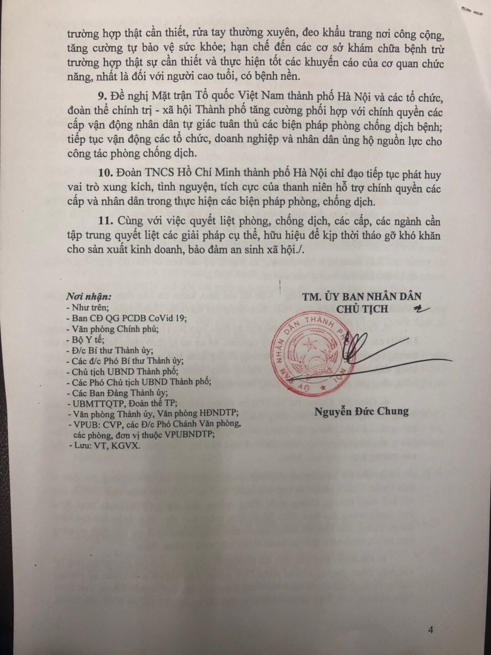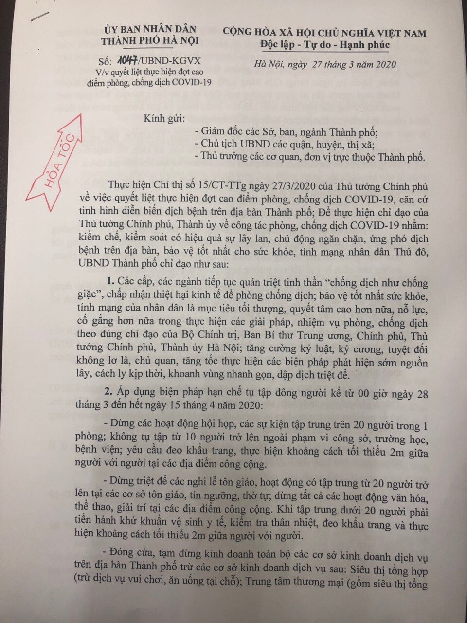 Công văn HỎA TỐC gửi các cấp lãnh đạo của thành phố Hà Nội thực hiện theo chỉ đạo của Thủ Tướng Nguyễn Xuân Phúc