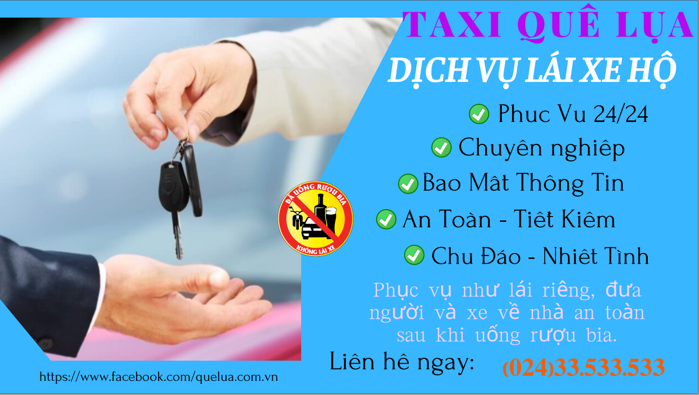# Bạn cần một bác tài chuyên nghiệp và an toàn để đưa xế cưng của bạn về nhà khi đã sử dụng rượu bia Taxi Quê Lụa hiện nay đã có dịch vụ cho thuê tài xế để đưa xe ô tô của khách về nhà. Với đội ngũ lái xe có nhiều năm kinh nghiệm, được đào tạo bài bản.